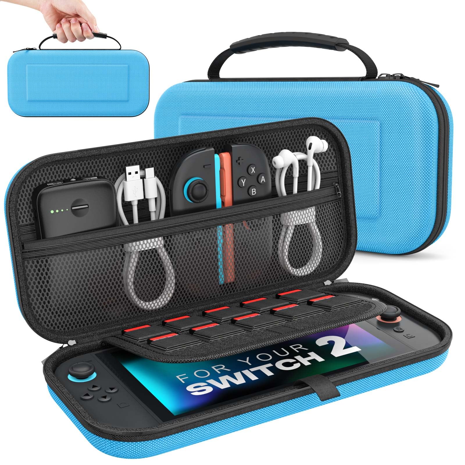 - Multiple Pockets: Our fanny pack features a front zippered pocket and a back zippered pocket, which can store items like keys, earbuds, power banks, chargers, phones, and wallets. The main pocket includes a Switch 2 or iPad Mini compartment, 2 mesh pockets, and 12 game card slots. It securely holds your Switch 2/iPad Mini, USB-C cables, HDMI cables, Joycon wrist straps, Pro controllers, game cards and more—making it easy to carry your device and accessories on the go.